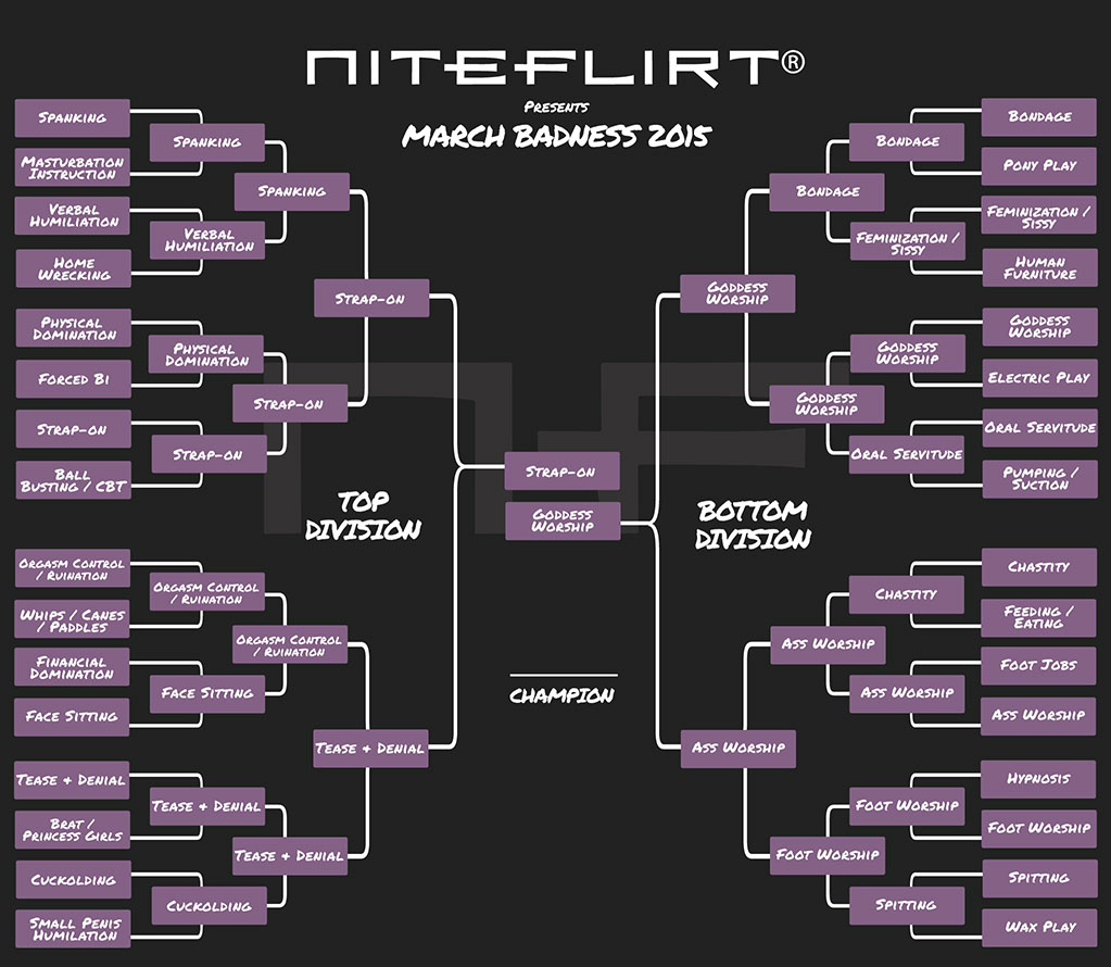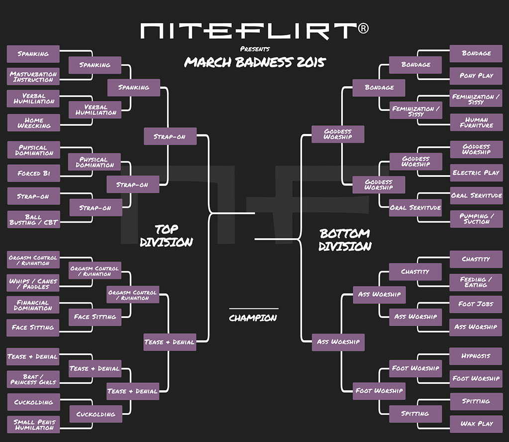 best_phone_sex_niteflirt_march_badness_fetish_2015_smallWe’ve separated our fetishes into two divisions: Top and Bottom. Vote for your favorite in each match to see it continue on to the next round. The voting schedule is below. Each round of voting will last for only a few days, depending on the round, so make your votes count! You’re allowed to vote once per hour.